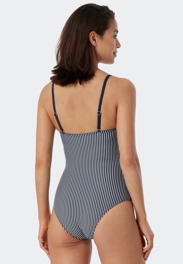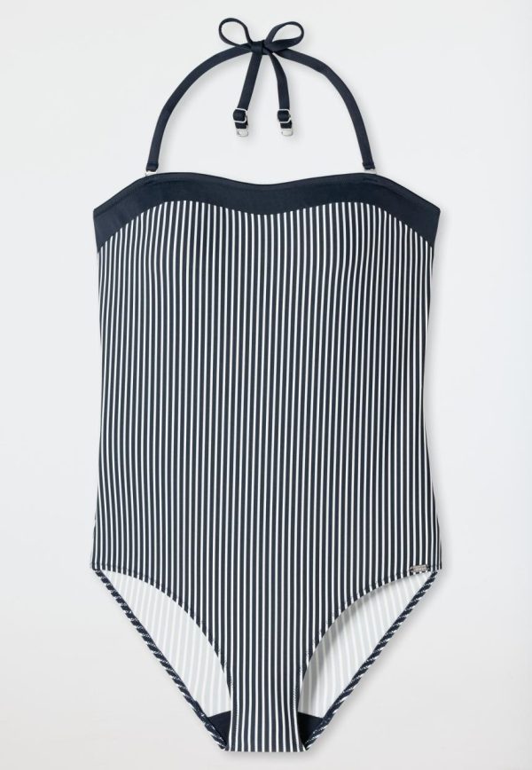 So elegant, so feminin: Dieser Bandeau-Badeanzug für Damen hat das gewisse Etwas! Klassische Streifen werden mit einem einfarbigen Band am Dekolleté hübsch abgesetzt. Der Einteiler aus elastischer, reycelter Microfaser ist zudem wunderbar flexibel: Die verstellbaren Träger können gerade, über Kreuz und als Neckholder gebunden – oder ganz abgenommen werden. Auf der Innenseite sorgen ein Silikonband und Softcups mit sanft stützendem Unterbrustband für optimalen Sitz. Beste SCHIESSER-Qualität!