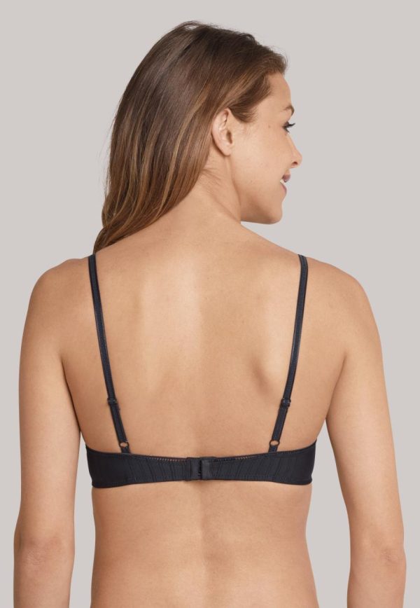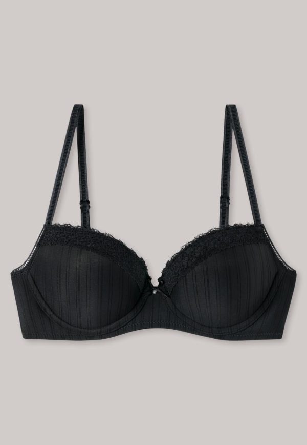 Dieser schwarze Bügel-BH bezaubert durch ein zartes Design und eine optimale Passform. Dezente Streifen, florale Spitze am Cuprand sowie das Schleifchen am Mittelsteg unterstreichen den femininen Charme des BHs, der mit zusätzlichen Seitenstäbchen eine wunderschöne Silhouette formt. Genau das Richtige für Damen, die gut sitzende Wäsche in bester, feiner SCHIESSER-Qualität schätzen.