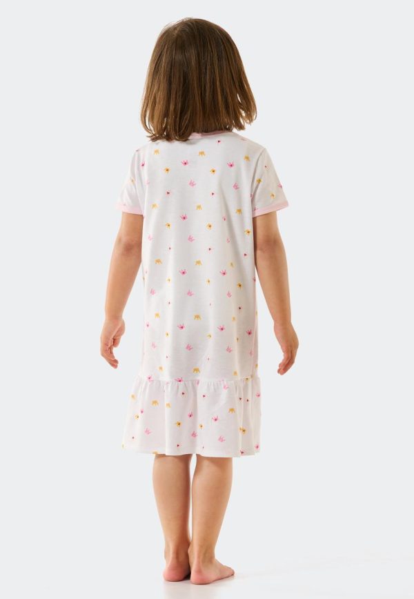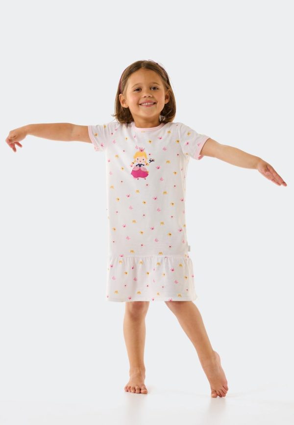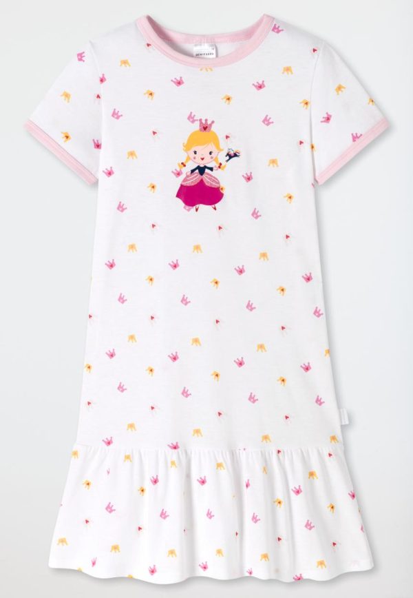 Dieses weiße Nachthemd ist ein wahr gewordener Mädchentraum! Im königlichen Krönchen-Allover sieht das Sleepshirt mit verspieltem Volant nicht nur wunderschön aus, sondern verzaubert zusätzlich mit einer kleiner Prinzessin, Mini-Einhorn und tollen Glitzer-Details. In feinstem Single Jersey aus 100% natürlicher Bio-Baumwolle lässt es sich herrlich kuscheln und vom nächsten Abenteuer auf Schlössern und Burgen träumen – natürlich in bester SCHIESSER-Qualität.