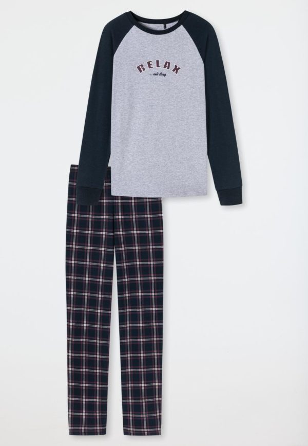- langer, grau-melierter Jungenschlafanzug mit „RELAX … and sleep“-Schriftzug und karierter Hose