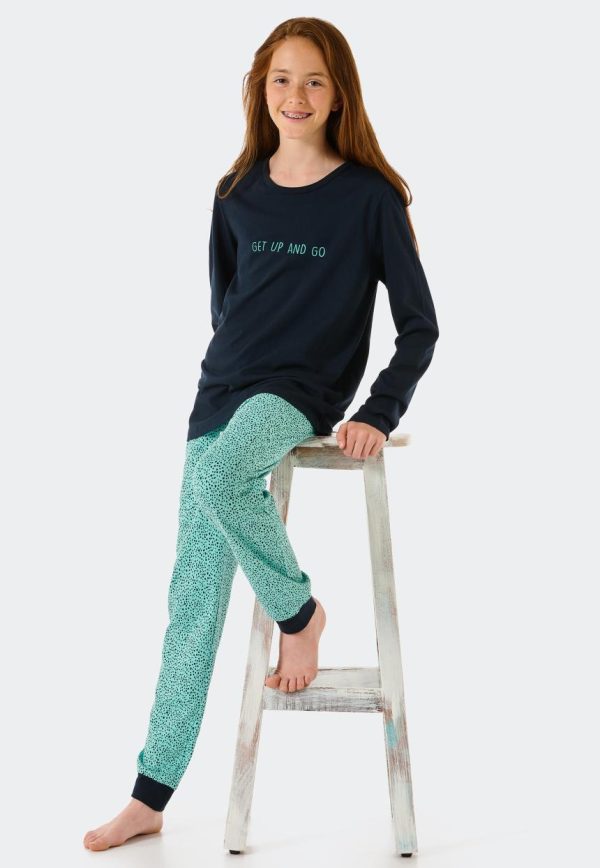 Mit diesem langen Mädchen-Schlafanzug sind süße Träume garantiert! Das schlichte, dunkelblaue Oberteil bekommt durch den mintfarbenen Spruch „Get up and go“ ein cooles Highlight. Abgerundet wird der Zweiteiler mit einer mint-blau getupften Schlafhose. Bequeme Bündchenabschlüsse und softer Single Jersey aus Organic Cotton machen das Tragegefühl perfekt – natürlich in bester SCHIESSER-Qualität!