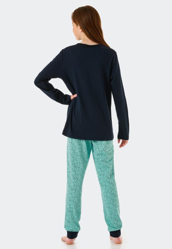 - langer Schlafanzug für Mädchen mit dunkelblauem Oberteil und mint-farbener Hose