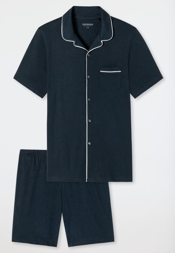 Dieser kurze, dunkelblaue Herren-Pyjama erfüllt alle Wünsche! Mit seiner schlanken Schnittform, weißen Paspeln und der Brusttasche strahlt er pure Eleganz aus. Weicher Interlock aus 100% Baumwolle verspricht hohen Tragekomfort. So steht entspannten Nächten in bester SCHIESSER-Qualität nichts mehr im Wege!
