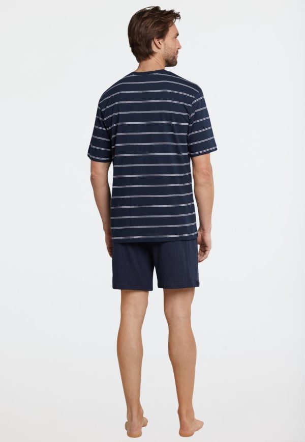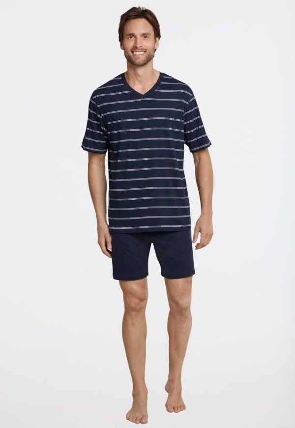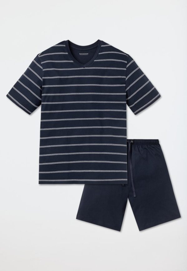 Dieser kurze, dunkelblaue Herrenschlafanzug verspricht angenehme Nächte in 100% weicher Baumwolle. Weiße, gestrickte Ringel und der dunkelblau akzentuierte V-Ausschnitt schenken dem Oberteil einen sportlichen Look, der perfekt durch die kurze, dunkelblaue Hose mit Bindeband am Bund und Gesäßtasche abgerundet wird. Ein unkomplizierter, bequemer Schlafanzug in bester SCHIESSER-Qualität!