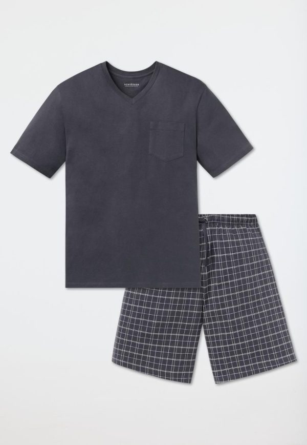 Dieser kurze, graue Schlafanzug punktet bei anspruchsvolle Herren durch ein stilvolles Design und 100% weiche Baumwolle. Das Oberteil mit V-Ausschnitt und Brusttasche bekommt mit der kurzen Hose mit grau-weißem Karomuster einen starken Partner, der mit einem Bindeband am Hosenbund ein praktisches Details mitbringt. Locker-leichter Single Jersey übernimmt den komfortablen Part und verspricht angenehme Nächte in bester SCHIESSER-Qualität!