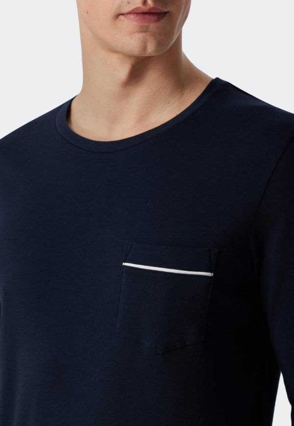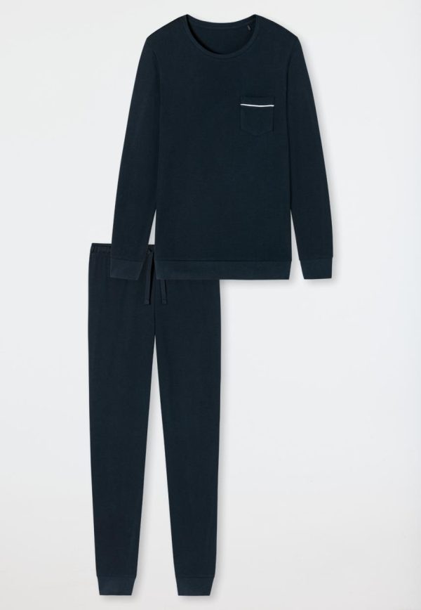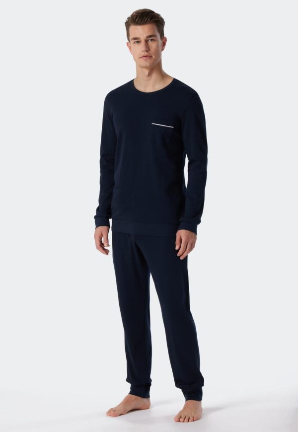 Maskulin, komfortabel, hochwertig: Dieser lange, dunkelblaue Herrenschlafanzug erfüllt alle Wünsche! Mit seiner schlanken Schnittform und der Brusttasche mit weißer Paspellierung strahlt er pure Eleganz aus. Die Bündchenabschlüsse sorgen dafür, dass alles top in Form bleibt. Fehlt nur noch der weiche Interlock-Stoff aus 100% Baumwolle sowie beste SCHIESSER-Qualität. So steht entspannten Nächten nichts mehr im Wege!