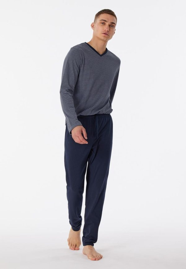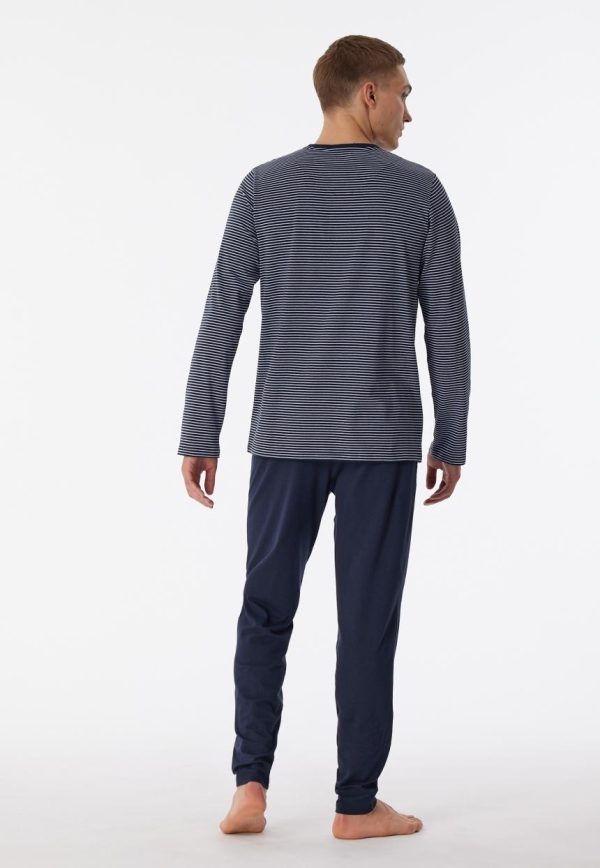 - langer Herren-Schlafanzug mit geringeltem Langarmshirt in Nachtblau und Off-white