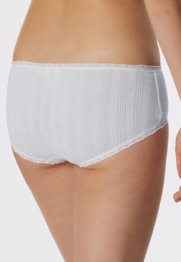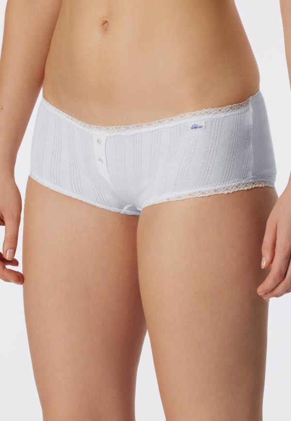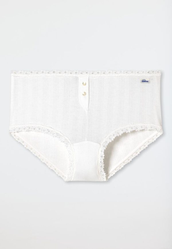 Ich heiße Agathe. Man nennt mich auch „die Liebliche“, denn ich bin ein Panty-Slip, der ganz charmant deine Feminität unterstreicht. Mein Markenzeichen ist die geblümte Bandspitze am Bund sowie an den Beinausschnitten und natürlich die beiden Perlmuttknöpfe an der kleinen Zier-Knopfleiste. Spürbar wird mein lieblicher Charme in traditionellem Feinripp Ajoureé. Dank Baumwolle, Modal und einem Hauch Elastan schmeichle ich deiner Haut unvergleichbar soft.