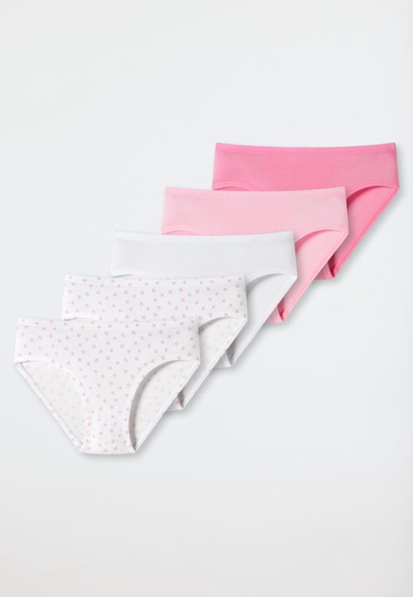 Diese hübschen Slips im praktischen 5er-Pack sind genau das Richtige für alle kleinen Prinzessinen! In frischem Weiß, Rosa, Pink oder Weiß mit rosafarbenen Punkten – hier strahlen alle kleine Mädchenaugen. Bestes Single Jersey-Material mit hautfreundlichem Organic Cotton und ein softer Bund fühlen sich perfekt am Körper an und sorgen für ein tolles Tragegefühl. Herrlich bequem in bester SCHIESSER-Qualität!