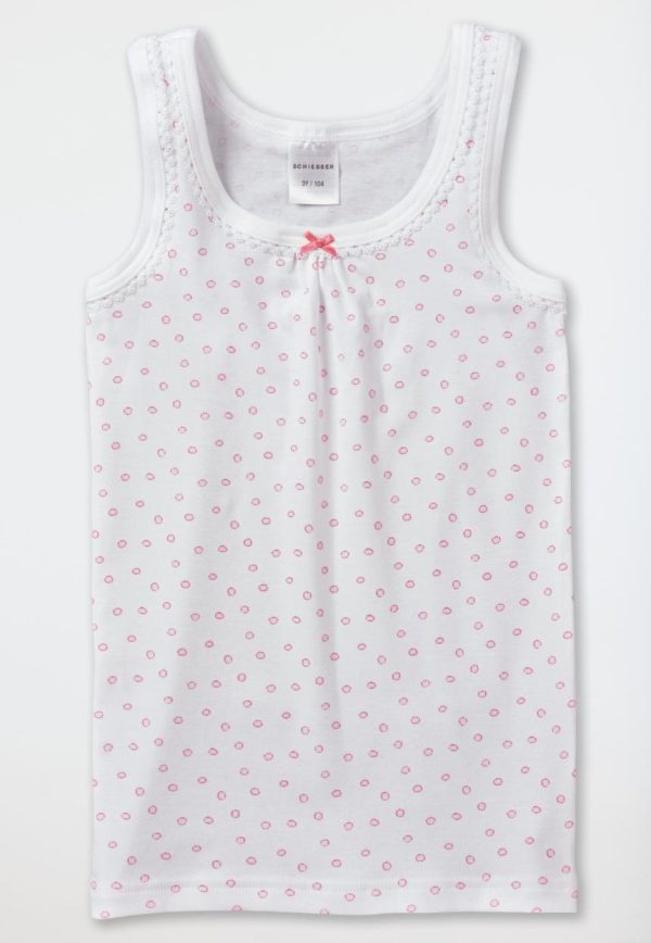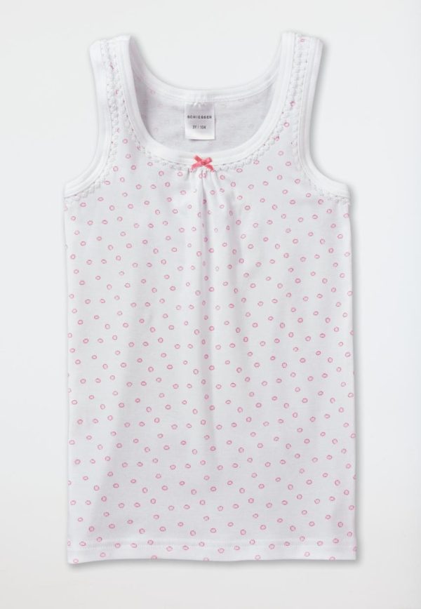 Tagwäsche im Tupfen-Look: Dieses weiße Mädchenunterhemd zaubert mit seinem hübschen Design und softem Material ein Leuchten in alle Mädchenaugen! Denn mit den rosafarbenen Tupfen, dem feinen Schleifchen und der zarten Verzierung an den Ausschnitten erhält das Hemdchen einen mädchenhaften Charme, der sich in hochwertiger, elastischer Feinripp-Qualität herrlich weich auf der Haut anfühlt. Wie gemacht für Mädels, die traumhaft-süße Wäsche in bester SCHIESSER-Qualität mögen!